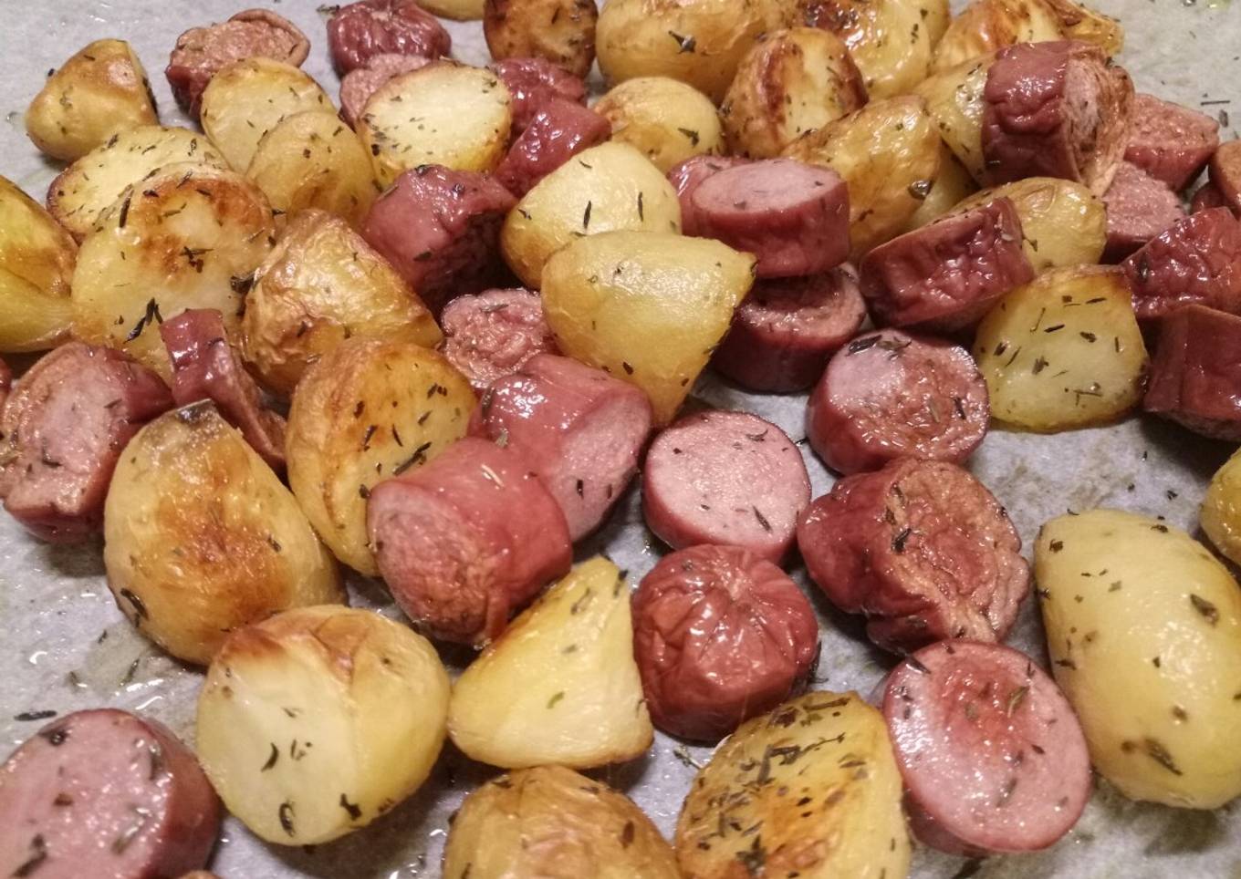 - Give a good mix to the potatoes, then chop up the sausages and throw them in. Add a good sprinkle of thyme. Cook for another 20-25 mins, mixing once or twice