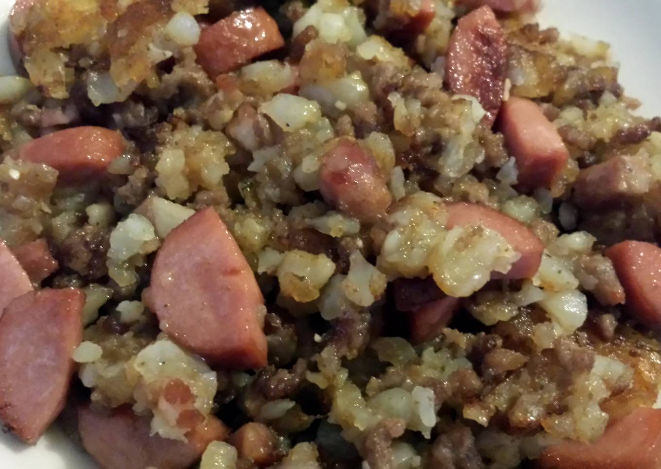 Steps to make to make Elisa's Fried Eggs over Meaty Potato Bed