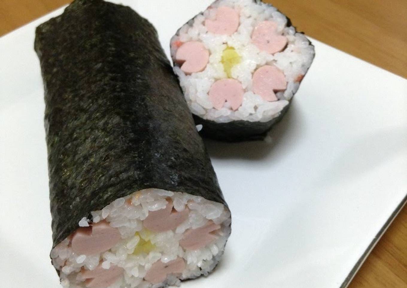 - Mix half of the sushi rice with the sakura denbu. Cut a small v-shape out along the sausage. Finely chop the takuan radish.