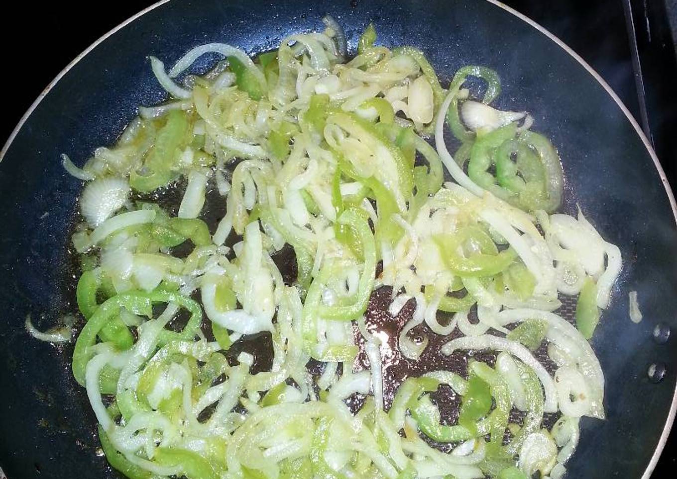 Steps to make to make Sauteed onions and green peppers with hamburger meat or hot dogs