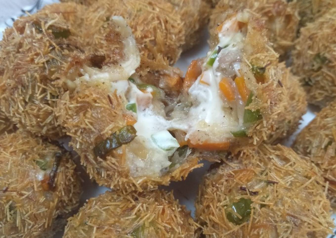 - Dip the ball in whisked egg and then coat in vermicelli.