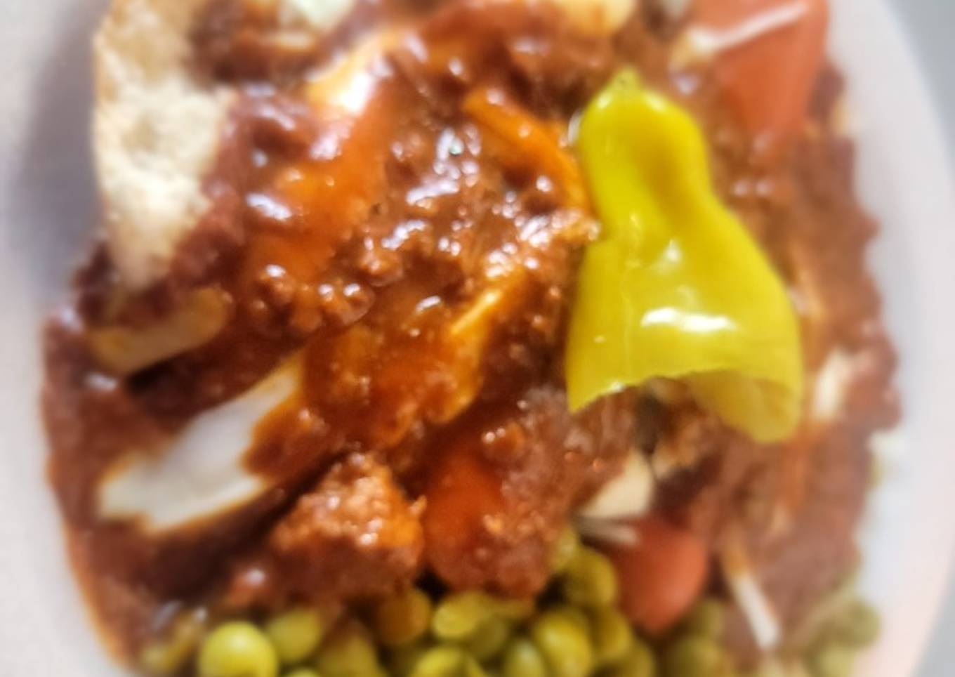 - Separately, in each its own bowl, cook or Microwave canned Chili and Canned Peas (add butter to peas)